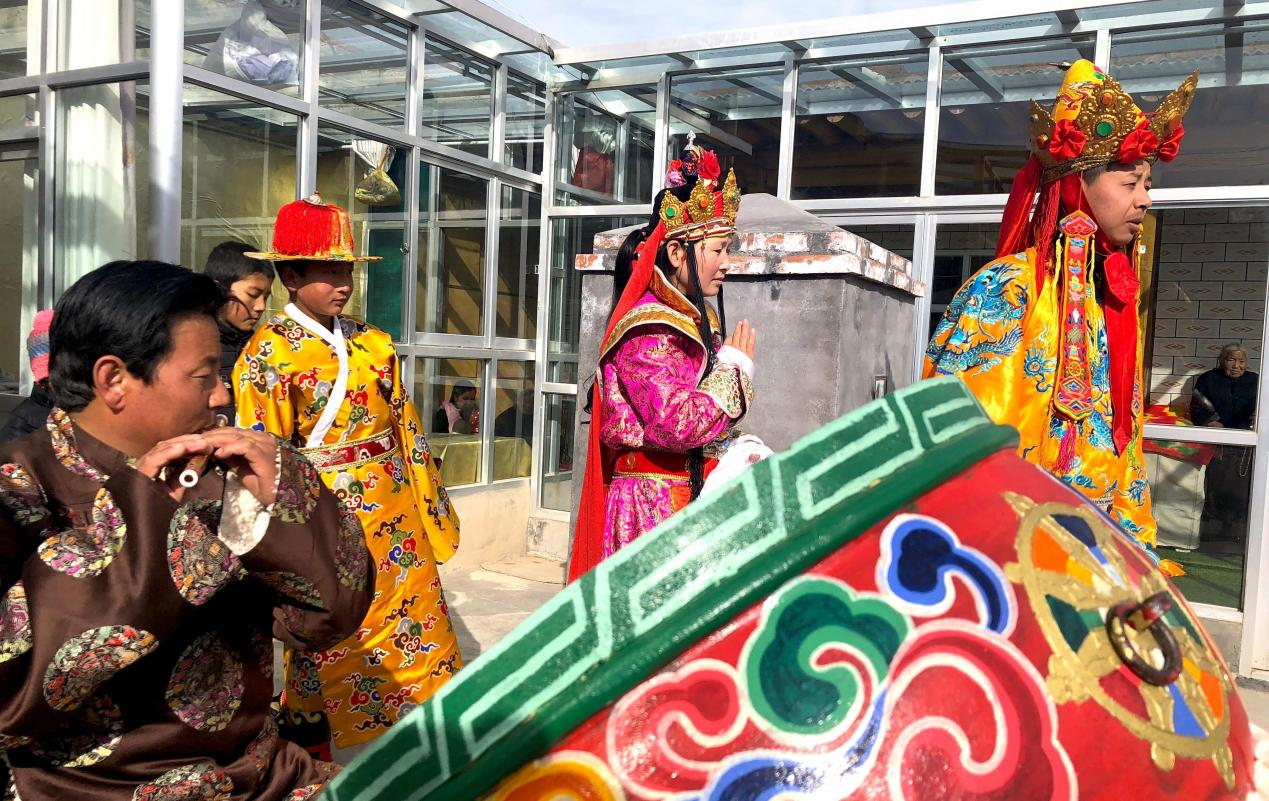 尖藏村村民正在排练藏戏《智美更登》。新华社记者 白玛央措 摄