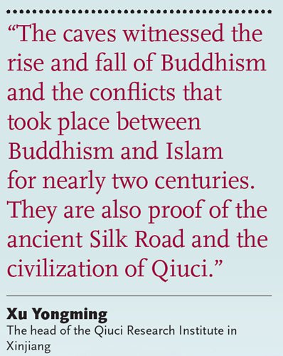 During the thousand years after their completion, the caves witnessed the rise and fall of Buddhism and the conflicts that took place between Buddhism and Islam for nearly two centuries. They are also proof of the ancient Silk Road and the civilization of Qiuci, Xu Yongming, head of the Qiuci Research Institute in Xinjiang, said at a seminar on the Kizil Caves in October 2015.
