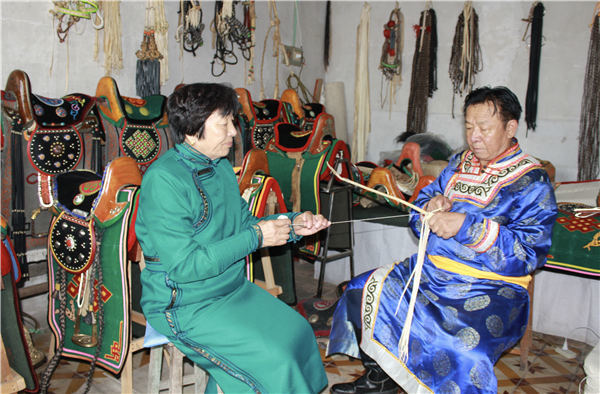 Togtonbayar and his wife work on a riding equipment. Togtonbayar, 73, is a national-level inheritor of China's intangible cultural heritage of Horqin Mongolian saddle-making in Tongliao in the Inner Mongolia autonomous region. [China Daily]