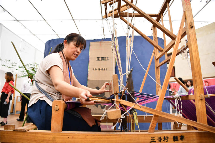 An inheritor demonstrates the traditional cotton-weaving technique at the Tianjin Art Museum in Tianjin, June 5, 2019. [Photo/Xinhua]