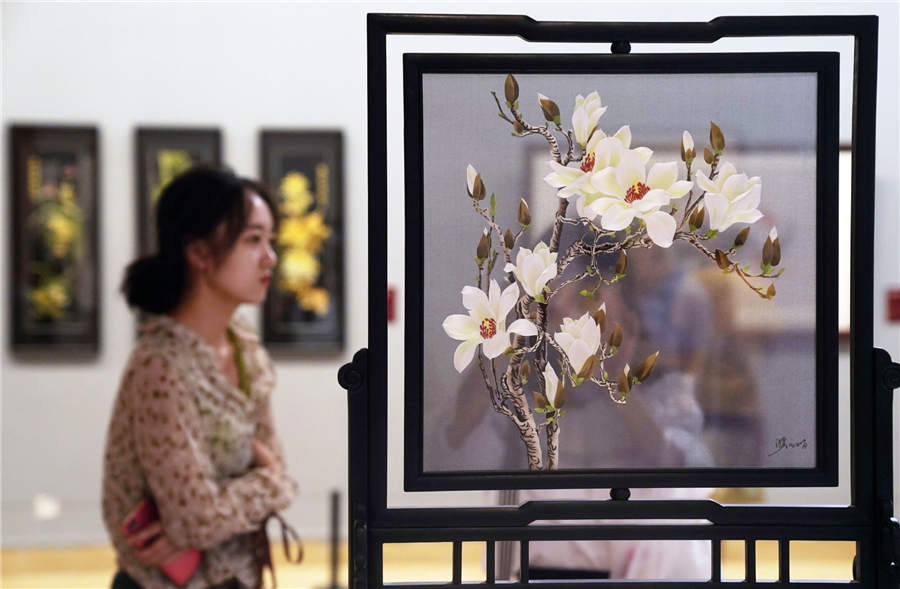 Su embroidery works on display at the National Art Museum of China in Beijing, July 19, 2019. [Photo/Xinhua]