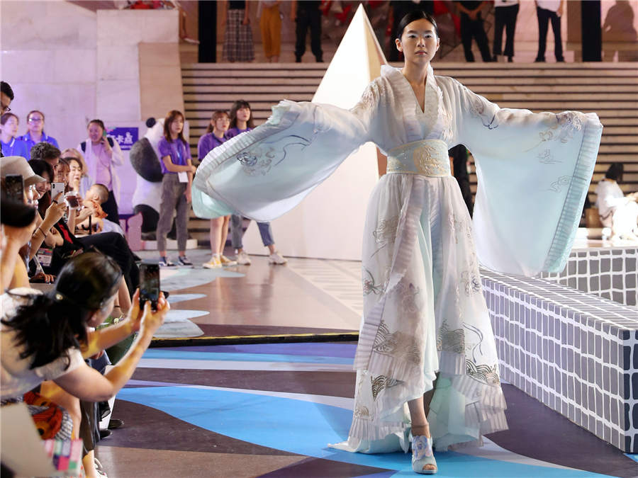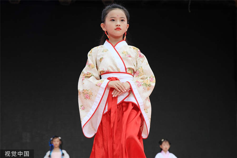 A girl presents a Han-style clothing during a children's fashion show in Nanjing city, Jiangsu province, Aug 10, 2019. [Photo/VCG]