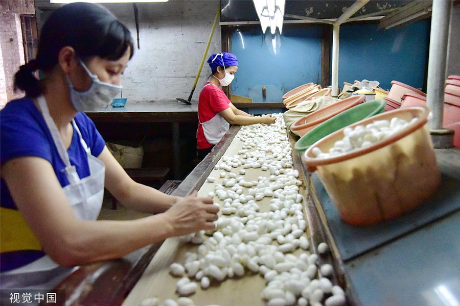 Students learn the sericulture and silk craftsmanship at a workshop in Foshan city, Guangdong province, July 26, 2019. [Photo/VCG]