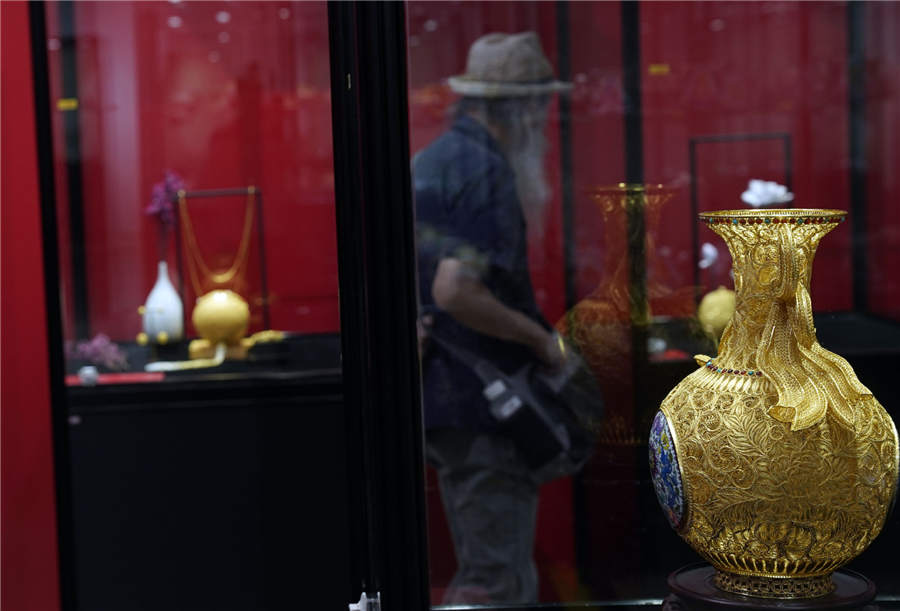 Filigree and inlay works on display at the Cultural Palace of Nationalities in Beijing, Aug 28, 2019. [Photo/Xinhua]