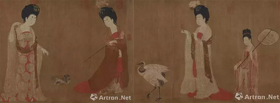 The ancient Chinese painting Ladies with Head-pinned Flowers shows ladies wearing silk flowers as head ornaments. [Photo/Artron.net]
