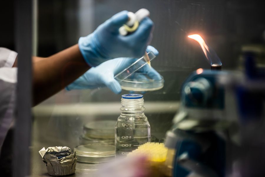 An inspector works at the lab of Spritzer Natural Mineral Water Plant in Taiping, Perak, Malaysia, Oct. 21, 2019. (Xinhua/Zhu Wei)