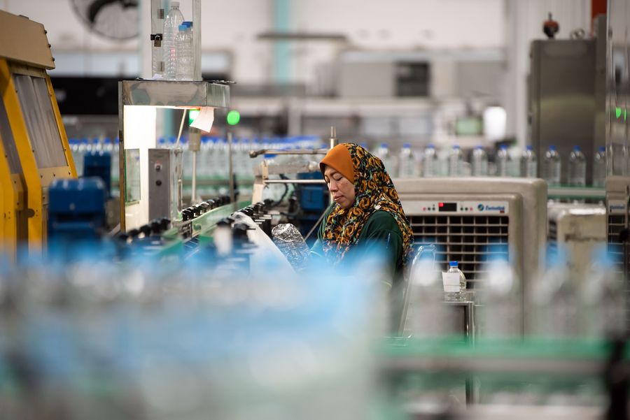 A man works at Spritzer Natural Mineral Water Plant in Taiping, Perak, Malaysia, Oct. 21, 2019. (Xinhua/Zhu Wei)