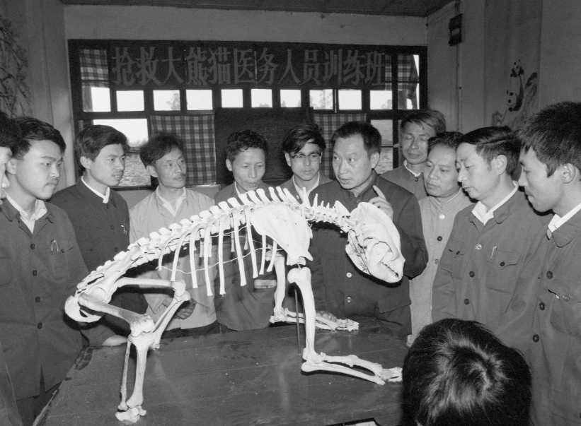 Photo taken in 1984 shows Hu Jinchu (M) offers training to local doctors based in 17 counties and districts in the habitat of giant pandas so that they can give first-aid to pandas in need. (Xinhua/Jin Xuqi)
