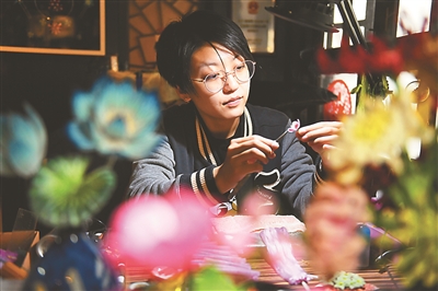 A young artist specializing in fabric sculpture from east China's Jiangsu Province has injected vitality into the intangible cultural heritage of silk and velvet flower making for the past three years.