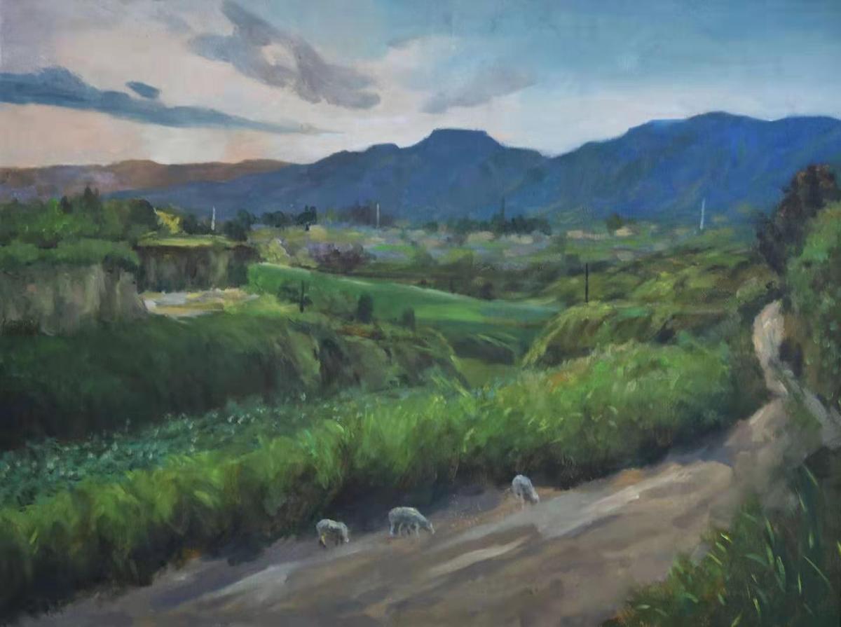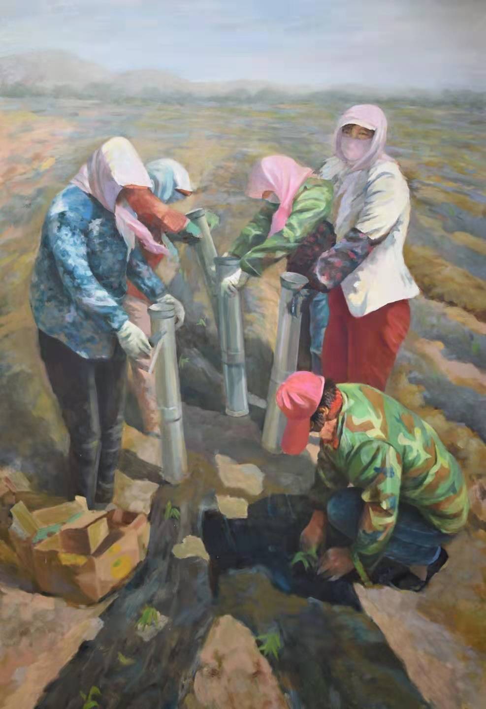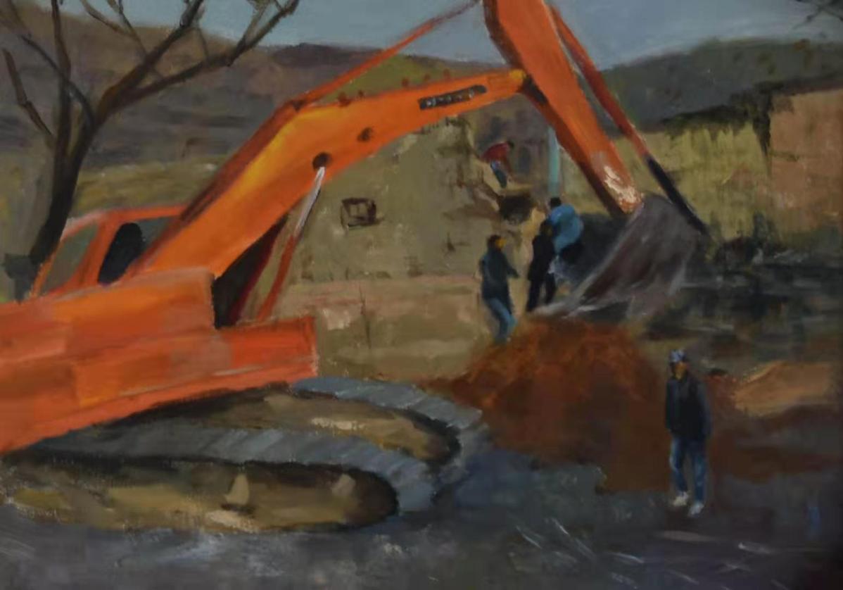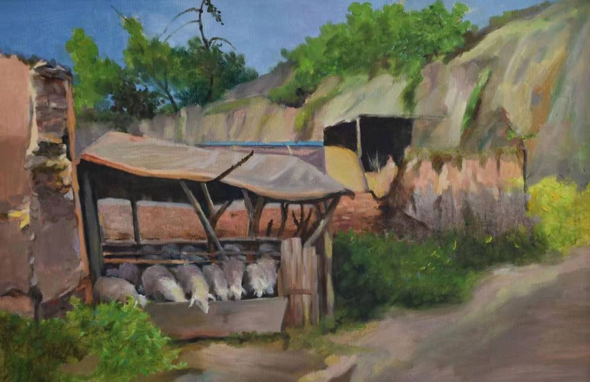 An oil painting created by Xue Fuli, who temporarily works at Nanchuan village in Xiji county in Northwest China's Ningxia Hui autonomous region to help the village rise above poverty and wants to record the scenes he has seen in the village and neighboring regions. [Photo provided to chinadaily.com.cn]