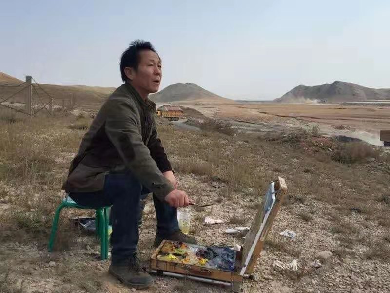 Xue Fuli, who temporarily works at Nanchuan village in Xiji county in Northwest China's Ningxia Hui autonomous region to help alleviate poverty, works on an oil painting that reflects scenes in the village. [Photo provided to chinadaily.com.cn]