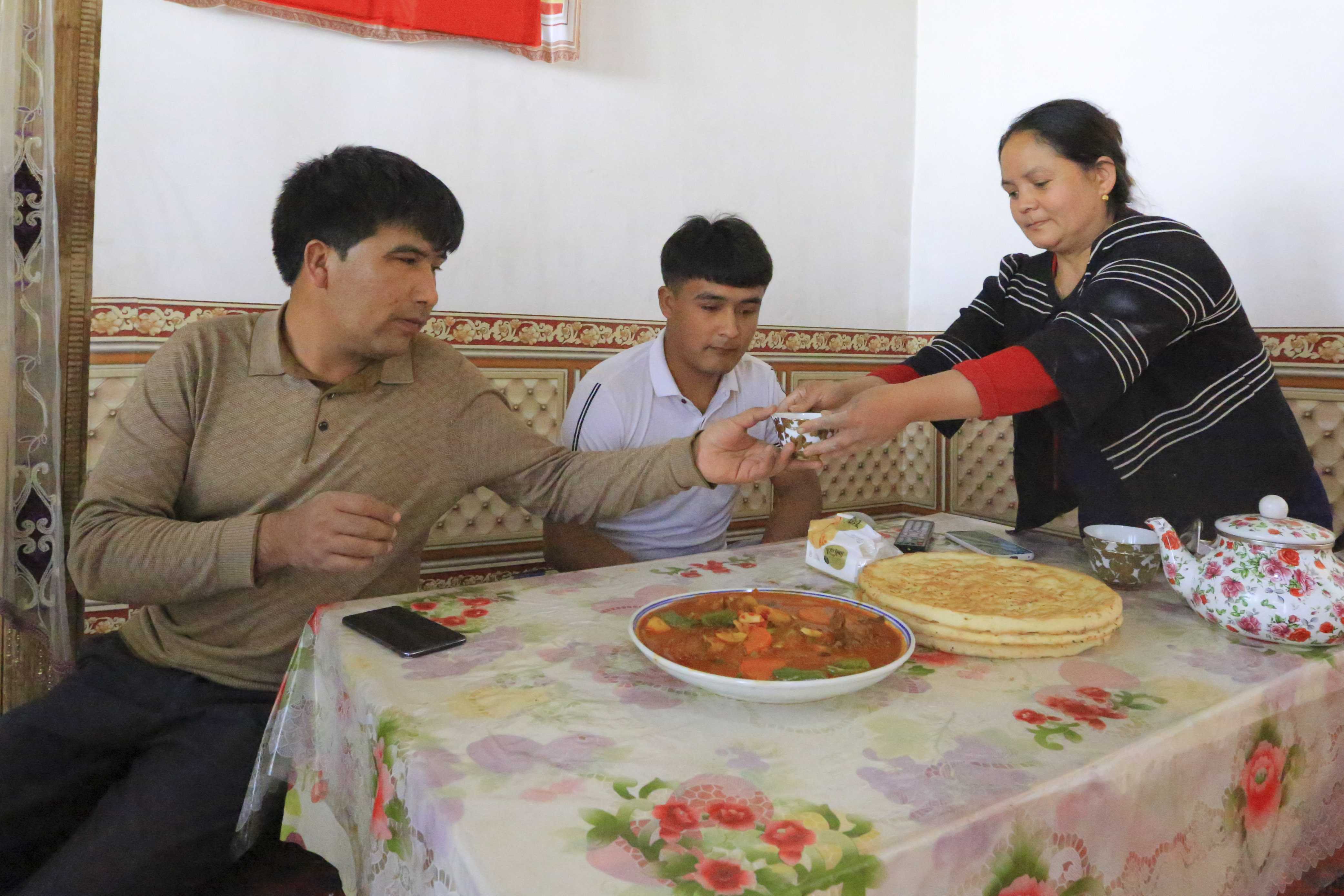 Memettursun Nurdun has dinner with his wife and son at home, March 24, 2020. (Xinhua/Ding Lei)