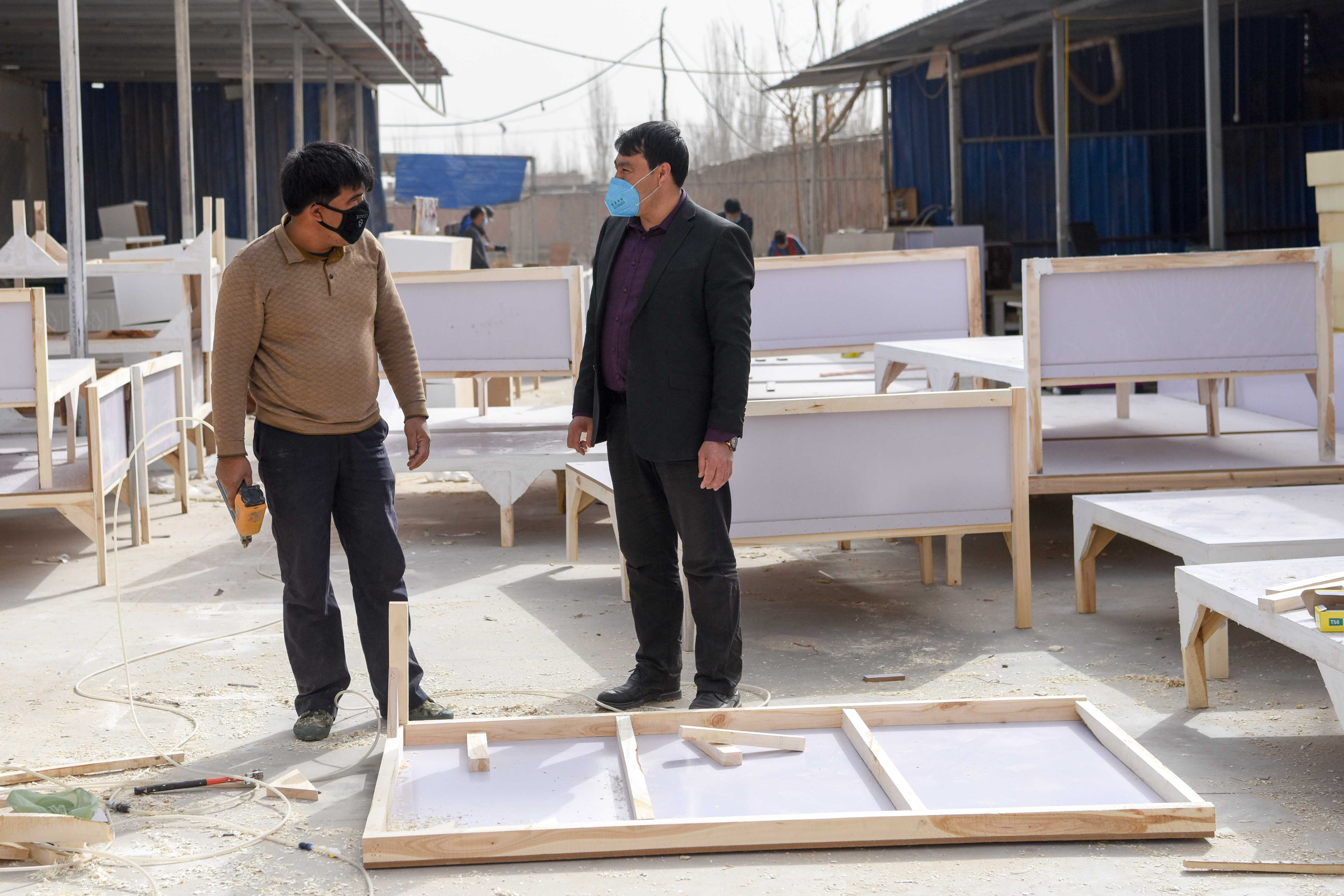 Memettursun Nurdun discusses with his boss in a furniture factory in Tuwan Taghwaz Village, Sagan Town, Yengisar County, northwest China's Xinjiang Uygur Autonomous Region, March 17, 2020. (Xinhua/Ding Lei)