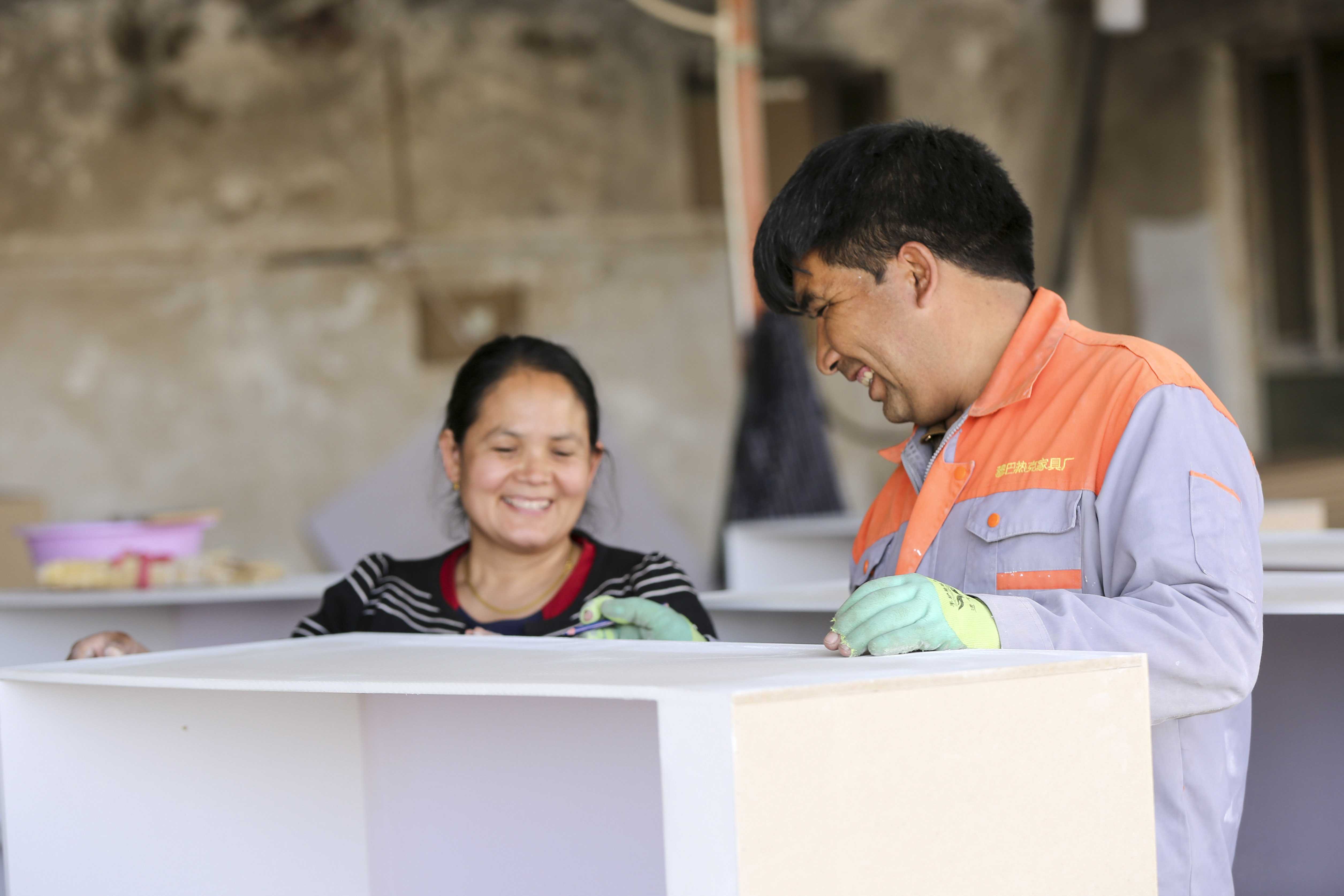 Memettursun Nurdun works with his wife in the furniture factory, March 24, 2020. (Xinhua/Ding Lei)