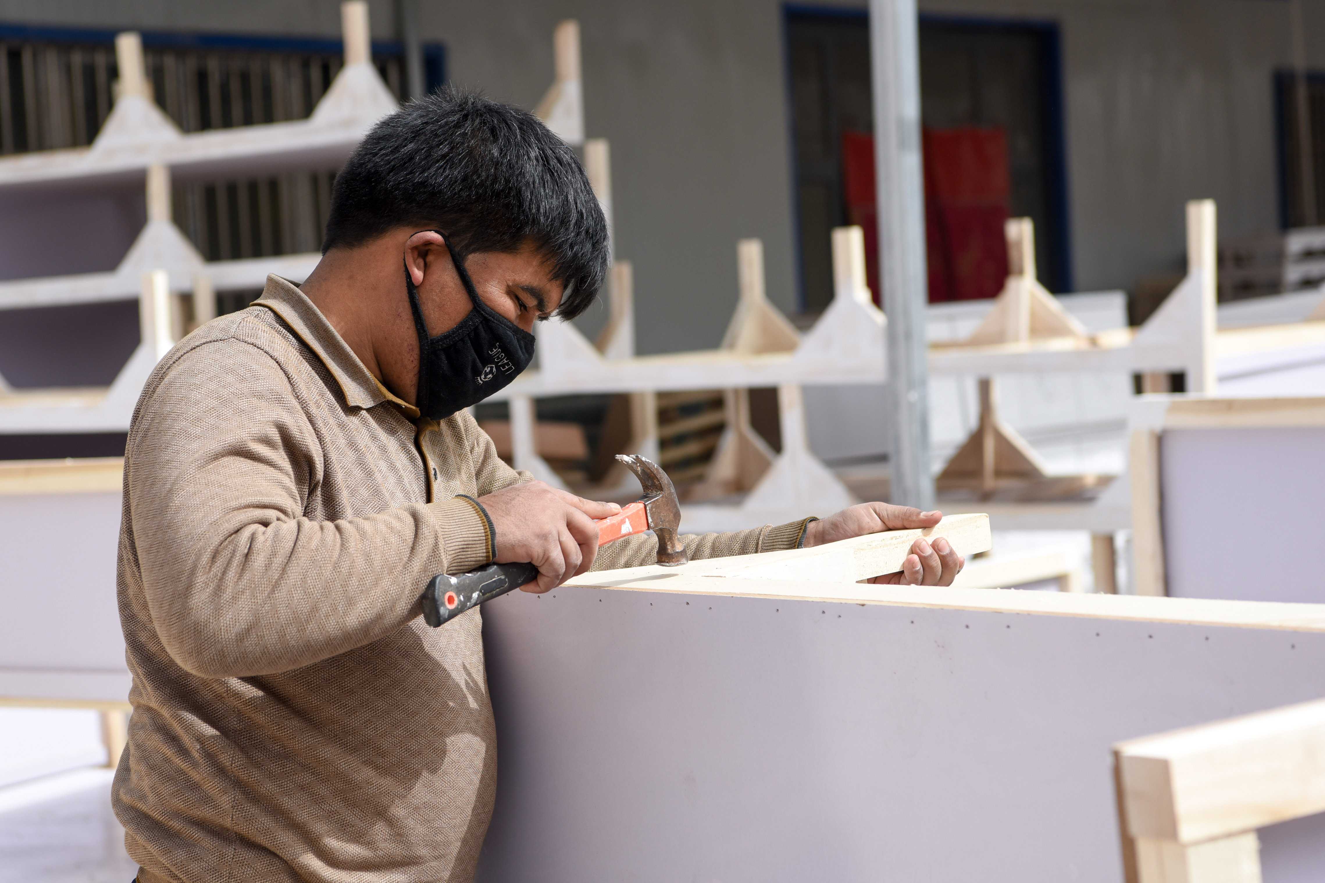 Memettursun Nurdun makes a bed in a furniture factory in Tuwan Taghwaz Village, Sagan Town, Yengisar County, northwest China's Xinjiang Uygur Autonomous Region, March 17, 2020. (Xinhua/Ding Lei)