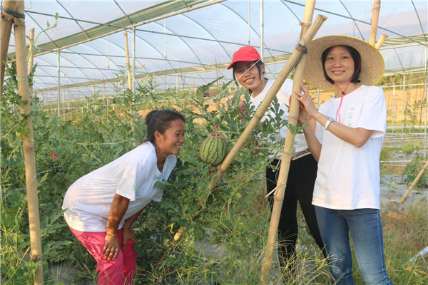 Zou Weiquan (right), who works to promote rural women's development, visits an ecological farming base with the villagers she's trying to help in Shixing county, Guangdong province. [Photo provided to China Daily]