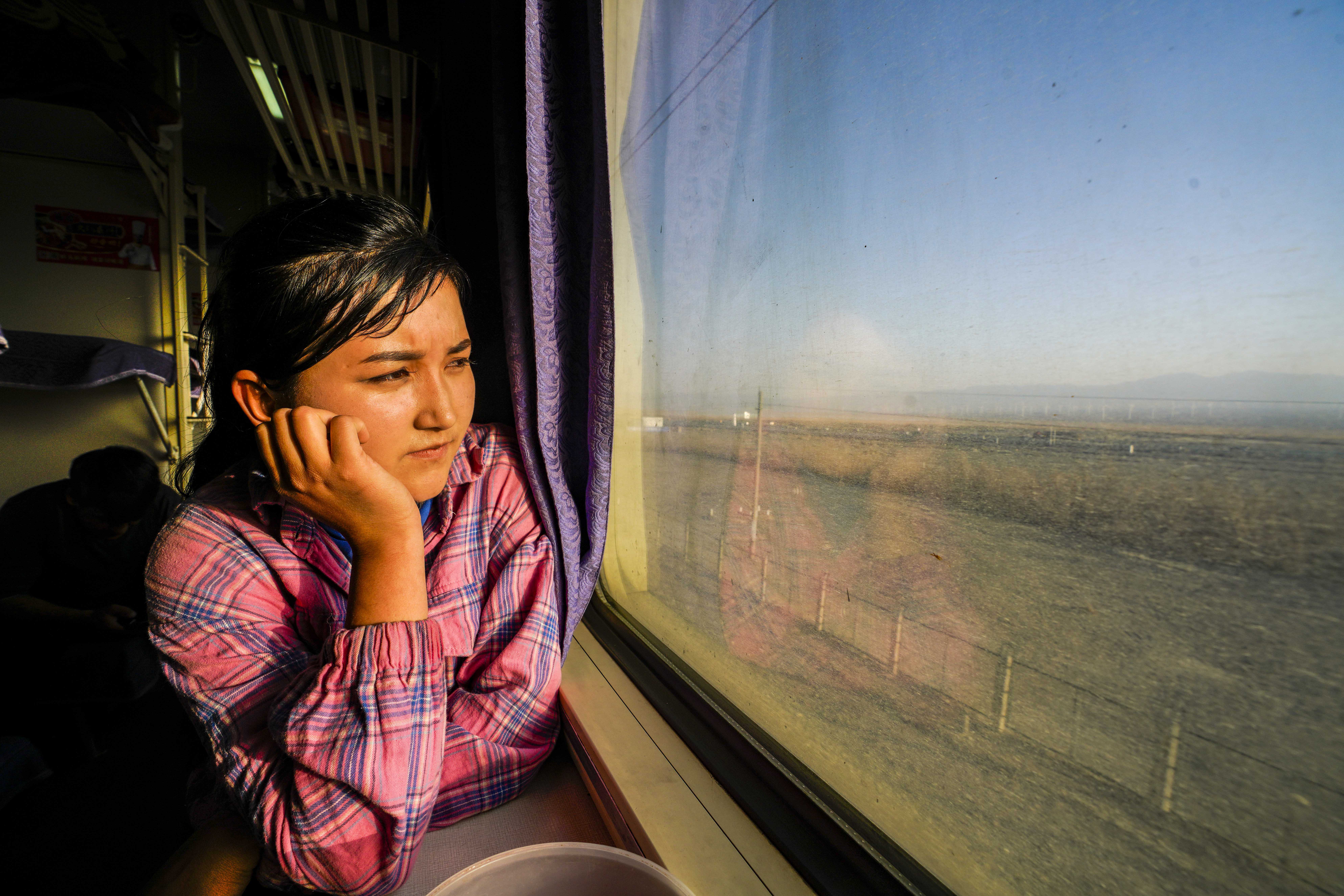 Buzeynep Abulehet looks out of the window on the train heading north to Fuhai County, northwest China's Xinjiang Uygur Autonomous Region, March 27, 2020. This year, Xinjiang has created 50,000 job vacancies in its eastern and northern parts for poverty-stricken households in Kashgar, Hotan and Kizilsu, in a bid to help 165,800 people from 10 poverty-stricken counties in southern Xinjiang to shake off poverty.(Xinhua/Zhao Ge)