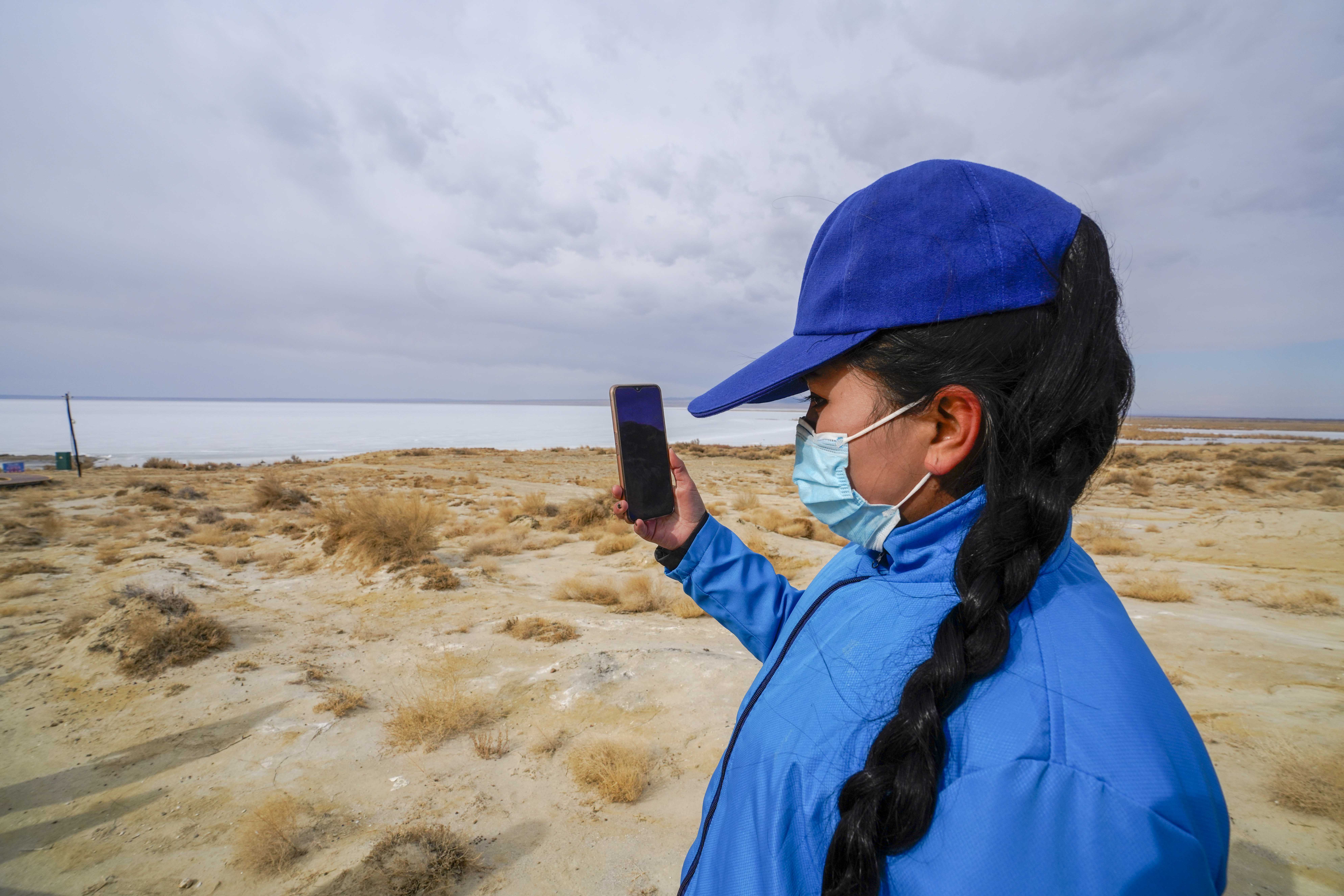 Buzeynep Abulehet takes photo as she sees the Ulungur lake for the first time in Fuhai County, northwest China's Xinjiang Uygur Autonomous Region, March 29, 2020. This year, Xinjiang has created 50,000 job vacancies in its eastern and northern parts for poverty-stricken households in Kashgar, Hotan and Kizilsu, in a bid to help 165,800 people from 10 poverty-stricken counties in southern Xinjiang to shake off poverty.(Xinhua/Zhao Ge)