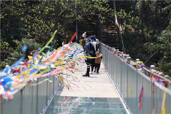 A tourist stops on a bridge to enjoy the scenery in Jingxian county, Anhui province on April 12. The bridge, built of steel and glass, is over a stream and leads to a mountain trail. [Photo by Zhu Lixin/China Daily]