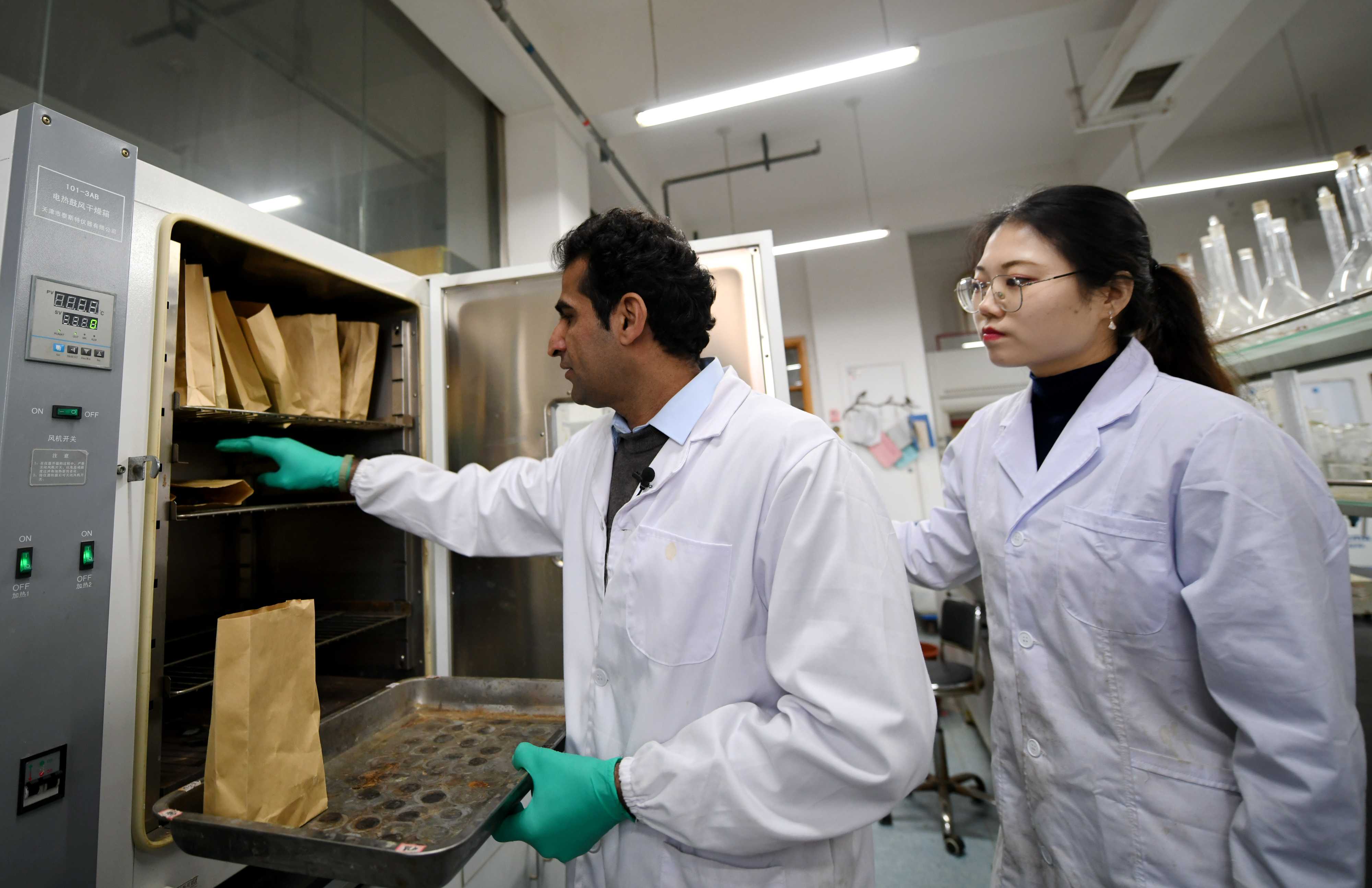 Abdul Ghaffar Shar (L) and his classmate conduct an experiment in China's Northwest Agriculture and Forestry University, northwest China's Shaanxi Province, Nov. 25, 2019. (Xinhua/Li Yibo)