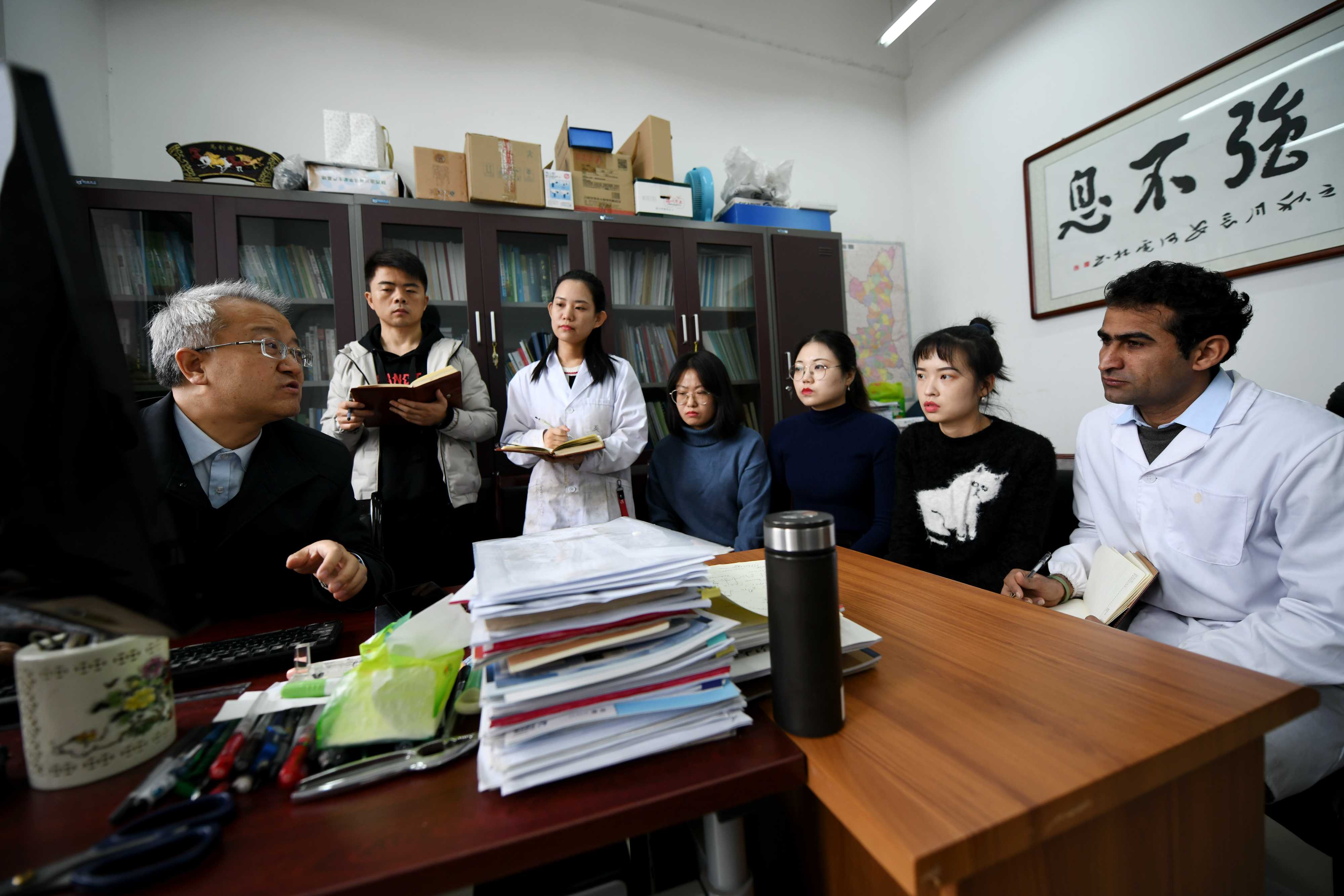 Abdul Ghaffar Shar (R) and his classmates discuss with their supervisor, Professor Tian Xiaohong, in China's Northwest Agriculture and Forestry University, northwest China's Shaanxi Province, Nov. 25, 2019. (Xinhua/Li Yibo)