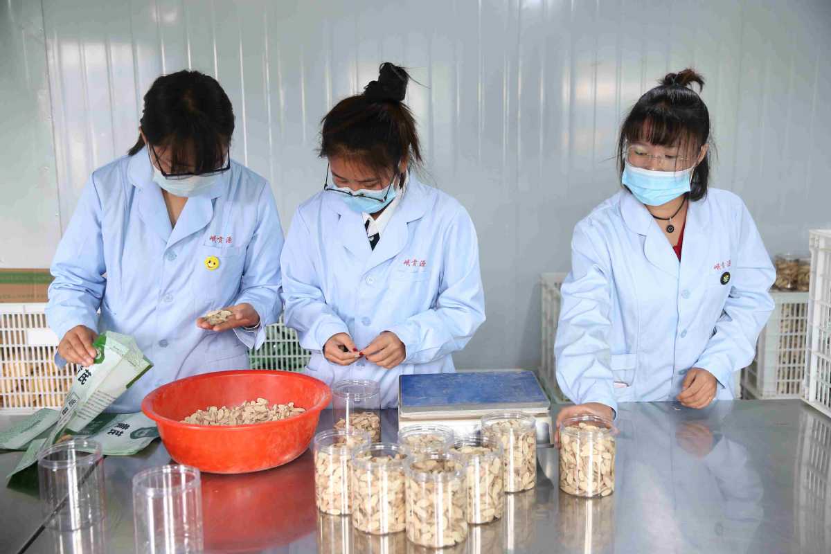 Workers pack huangqi products in a farmer's cooperative in Minxian county, Northwest China's Gansu province, on Sept 1, 2020. [Photo by Wu Xiaohui/chinadaily.com.cn]
