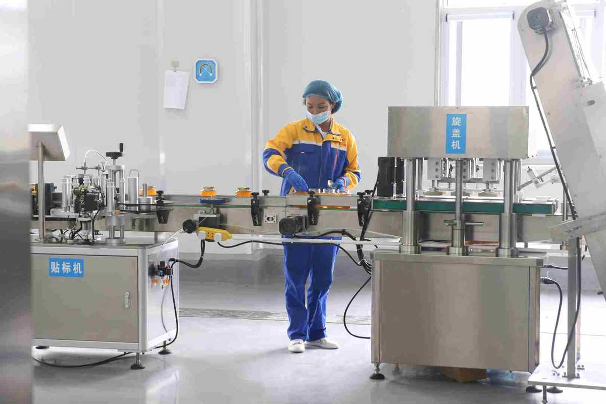 A worker is seen tending to the production line of huangqi honey in a workshop of the Yonghui Agricultural Development Co LTD, an East-West poverty alleviation project in Minxian county, Northwest China's Gansu province, on Sept 1, 2020. [Photo by Wu Xiaohui/chinadaily.com.cn]