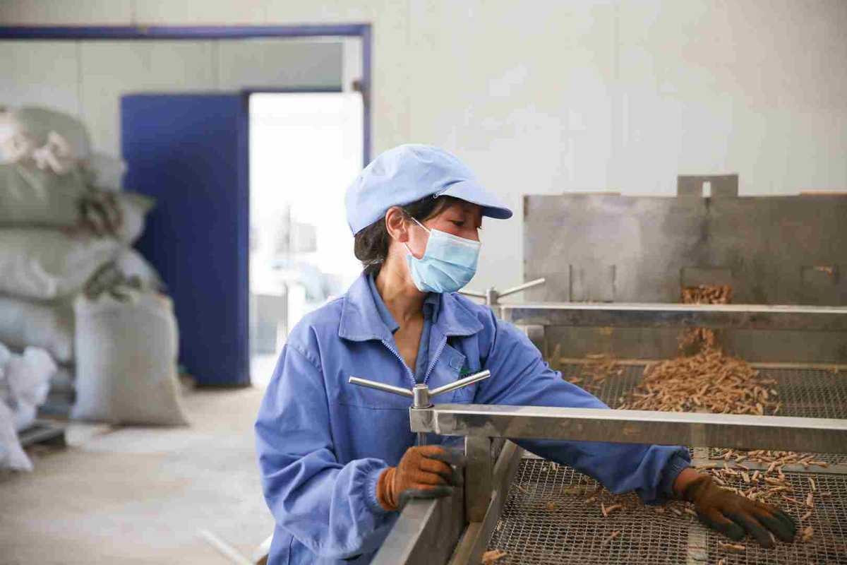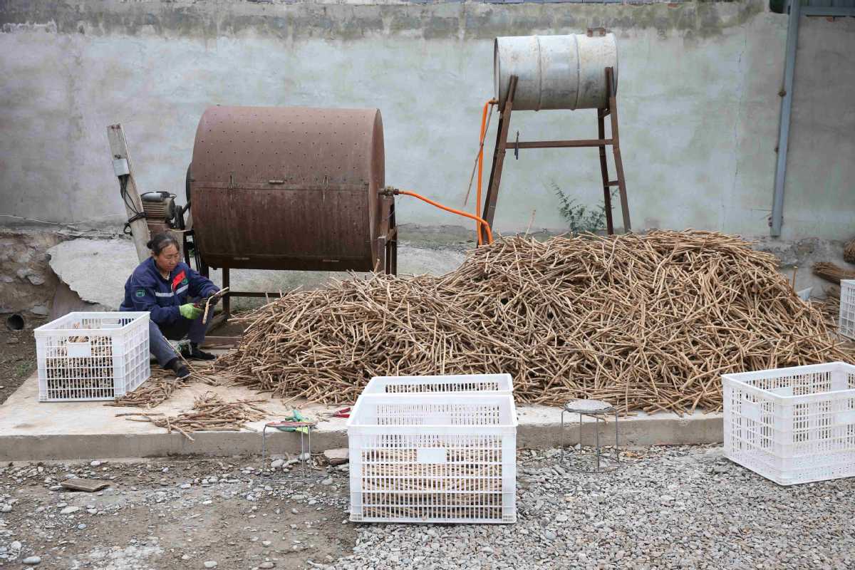 A worker conducts preliminary screening on huangqi in a farmer's cooperative in Minxian county, Northwest China's Gansu province, on Sept 1, 2020. [Photo by Wu Xiaohui/chinadaily.com.cn]
