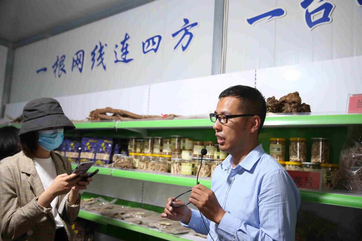 Wang Jun, from the Export-Import Bank of China, introduces e-commerce sales of Chinese medicinal products to reporters on Sept 1, 2020. He is working as a temporary deputy head of Minxian county in poverty alleviation work. [Photo by Wu Xiaohui/chinadaily.com.cn]