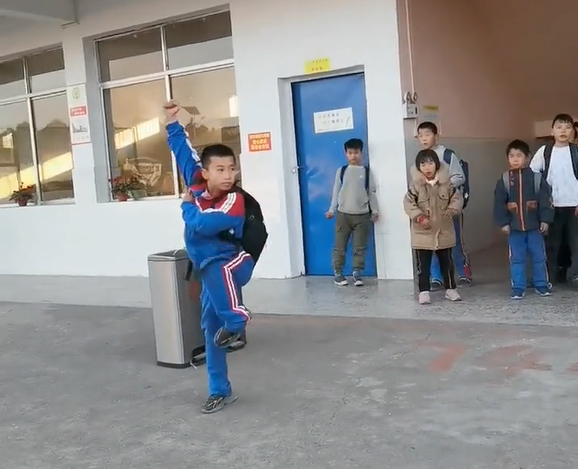 As students swamp downstairs after school, their classmate stuns them with his martial arts skills. After reaching the first floor, the boy somersaults toward the nearby trash can to throw away rubbish. Forward lunge, horse stance, pushing palm, and sweeping leg, he performs Shaolin-style boxing without any pause.