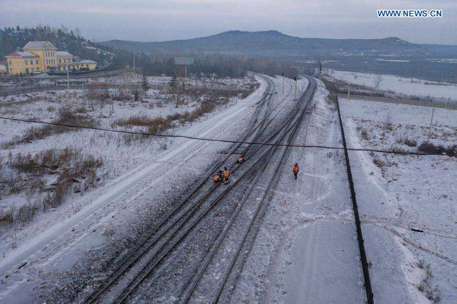 Railway workers maintain railroad switches at Mohe Station in Mohe City, northeast China's Heilongjiang Province, Jan. 11, 2021.