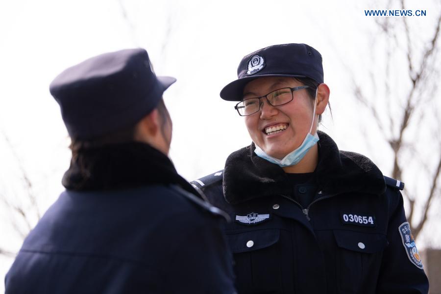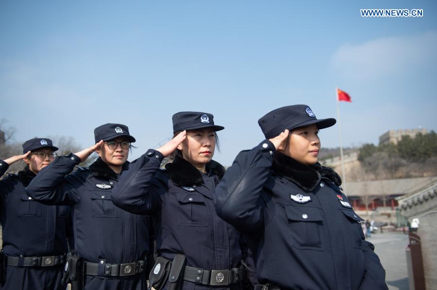 Members of the female police force of Badaling Police Station are seen at the Badaling Great Wall in Beijing, capital of China, March 7, 2021.