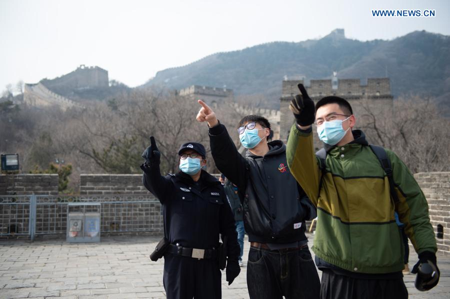 Wu Jingxuan (1st, L), head of the female police force of Badaling Police Station, shows tourists the way on the Badaling Great Wall in Beijing, capital of China, March 7, 2021.