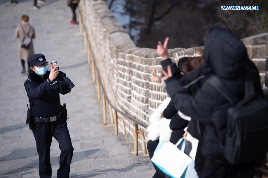 Wu Jingxuan, head of the female police force of Badaling Police Station, helps tourists to take photos on the Badaling Great Wall in Beijing, capital of China, March 7, 2021.