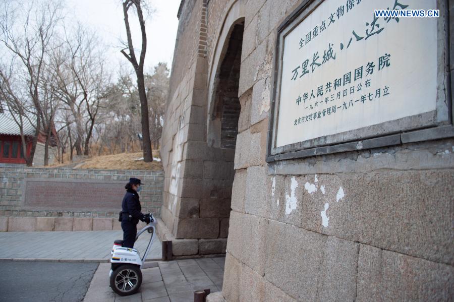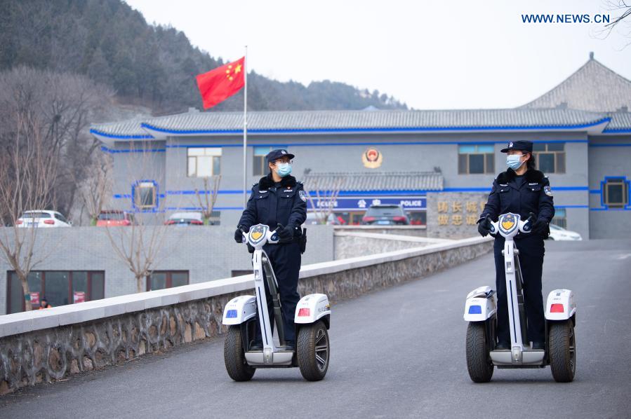 Hu Wenhui, a member of the female police force of Badaling Police Station, patrols at the Badaling scenic area with a self-balancing scooter in Beijing, capital of China, March 7, 2021.