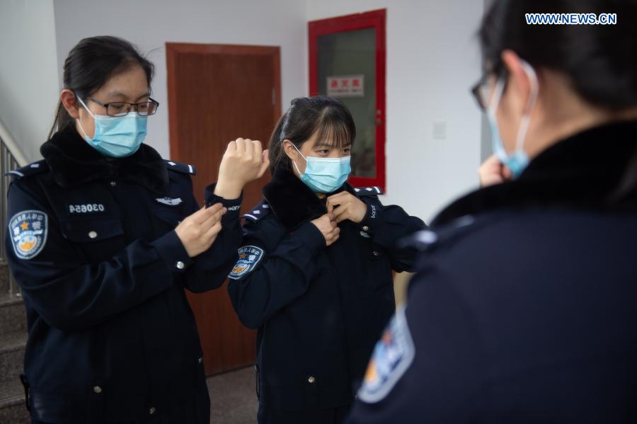 Zhang Anqi (L) and Liu Xuwen, members of the female police force of Badaling Police Station, tidy themselves up in Beijing, capital of China, March 7, 2021.