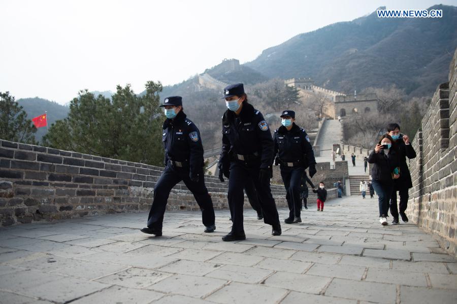 Liu Xuwen (L, front) and Zhang Anqi (L, behind), members of the female police force of Badaling Police Station, help foreign tourists on the Badaling Great Wall in Beijing, capital of China, March 7, 2021.