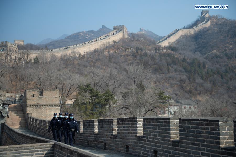 Members of the female police force of Badaling Police Station patrol on the Badaling Great Wall in Beijing, capital of China, March 7, 2021