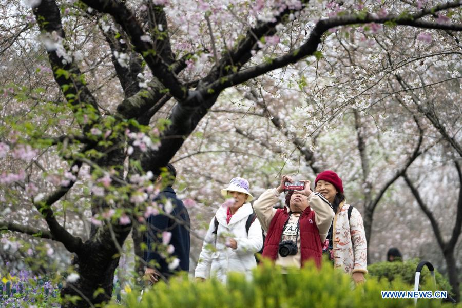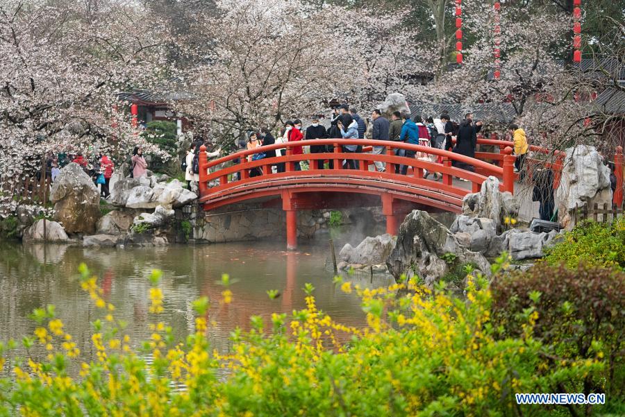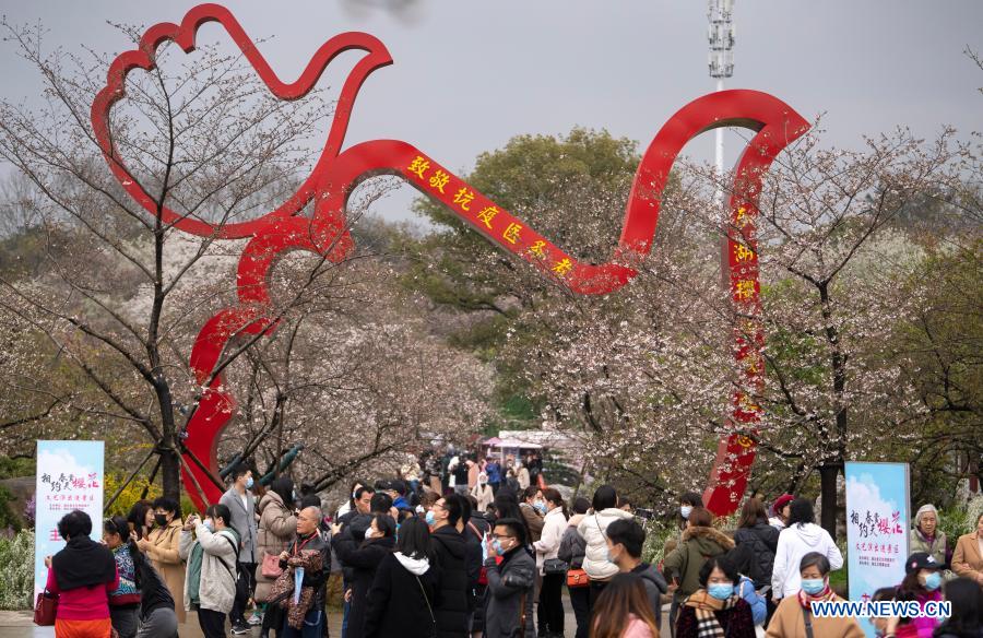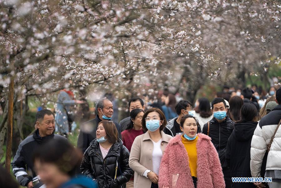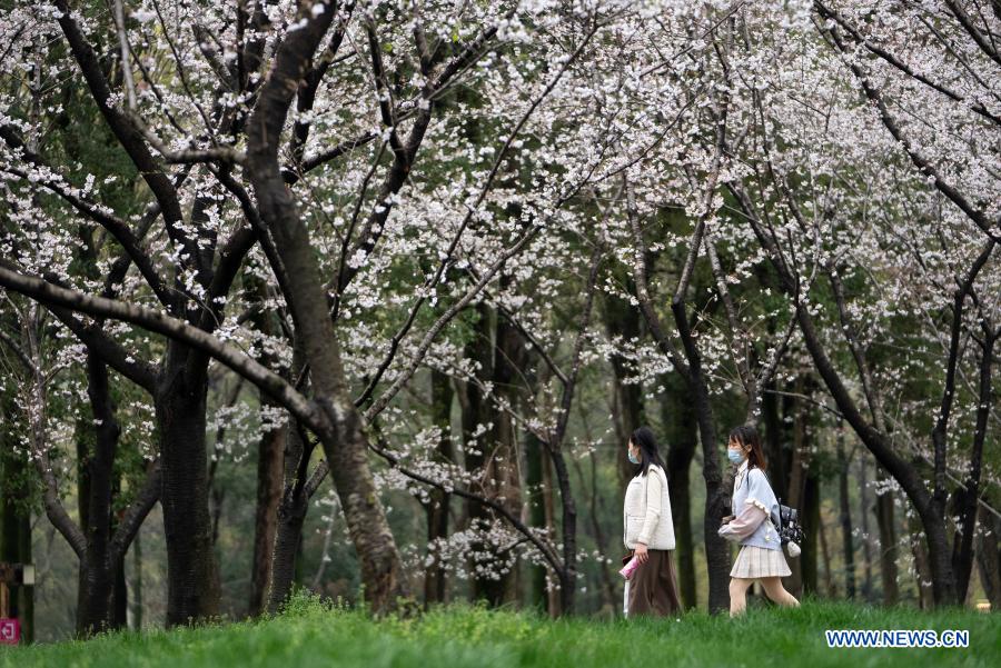 Tourists view blooming cherry blossoms at the Moshan scenic spot by the East Lake in Wuhan, central China's Hubei Province, March 11, 2021. (Xinhua/Xiong Qi)