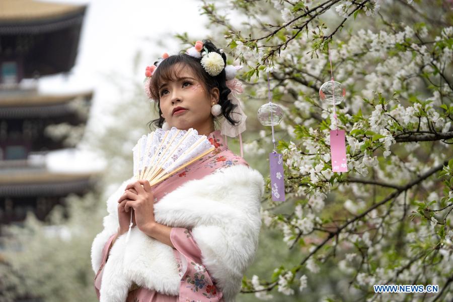A tourist poses beside blooming cherry blossoms at the Moshan scenic spot by the East Lake in Wuhan, central China's Hubei Province, March 11, 2021. (Xinhua/Xiong Qi)