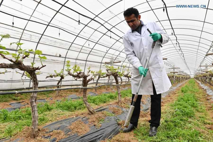 Abdul Ghaffar Shar collects soil samples at a cherry plantation of Yangling agricultural hi-tech industrial demonstration zone in northwest China's Shaanxi Province, March 17, 2021. (Xinhua/Zhang Bowen)