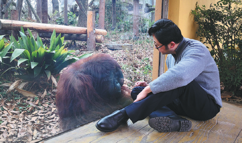 Shen Zhijun watches an orangutan at Nanjing Hongshan Forest Zoo in Jiangsu province. CHINA DAILY