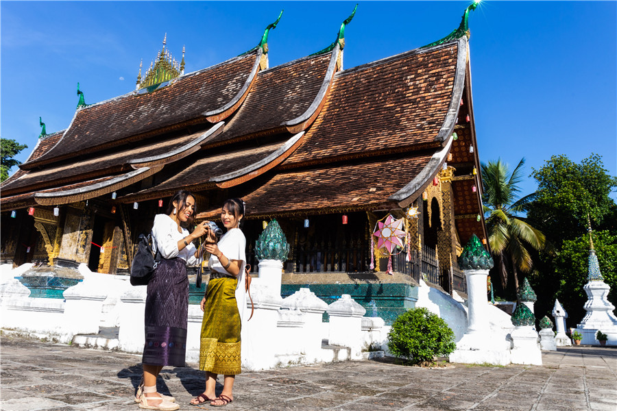 Visitors take photos in front of a temple in Luang Prabang in October. [Photo/Xinhua]