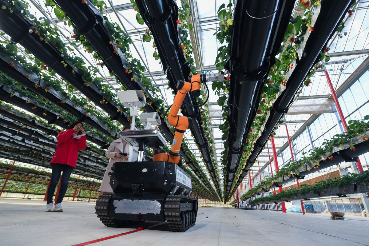 A robot picks strawberries at a strawberry greenhouse in Jiande city, South China's Guangdong province, Jan 9, 2021. [Photo/Xinhua]