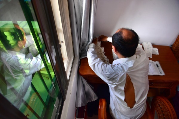 Rice expert Guo Guoqiang sorts out the seed materials at the Maize Breeding Base of the Hengyang Academy of Agricultural Sciences in Sanya. He does not even have time to mend his torn shirt.[Photo by Guo Liliang/For China Daily]