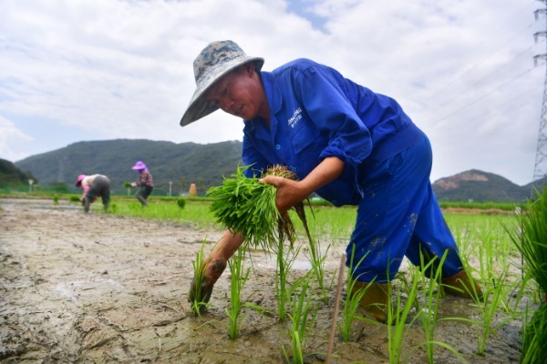 At the Maize Breeding Research Garden of Hunan Province in Yelin town, Lingshui, Hainan, a technician plants early rice seedlings in the experimental field.[Photo by Guo Liliang/For China Daily]