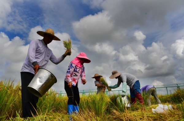 In the Hunan Maize Breeding Research Park in Yelin town, Lingshui, Hainan province, technicians from the Maize Breeding Base of Hunan Agricultural University harvest rice seeds for small varieties.[Photo by Guo Liliang/For China Daily]