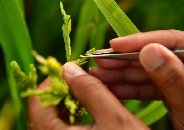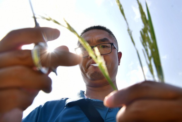 Rice cultivation expert Li Jianwu selects the male parents of small varieties for artificial cross-pollination.[Photo by Guo Liliang/For China Daily]