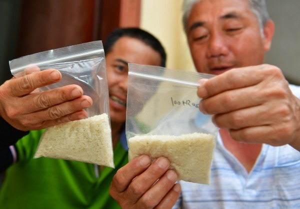 Chen Jianqiu (left) and Xu Decai, technicians from the Maize Breeding Base of Hunan Agricultural University, use a rice mill to beat the newly harvested sterile varieties and observe their appearance and quality, in Tengqiao town, Sanya, Hainan.[Photo by Guo Liliang/For China Daily]