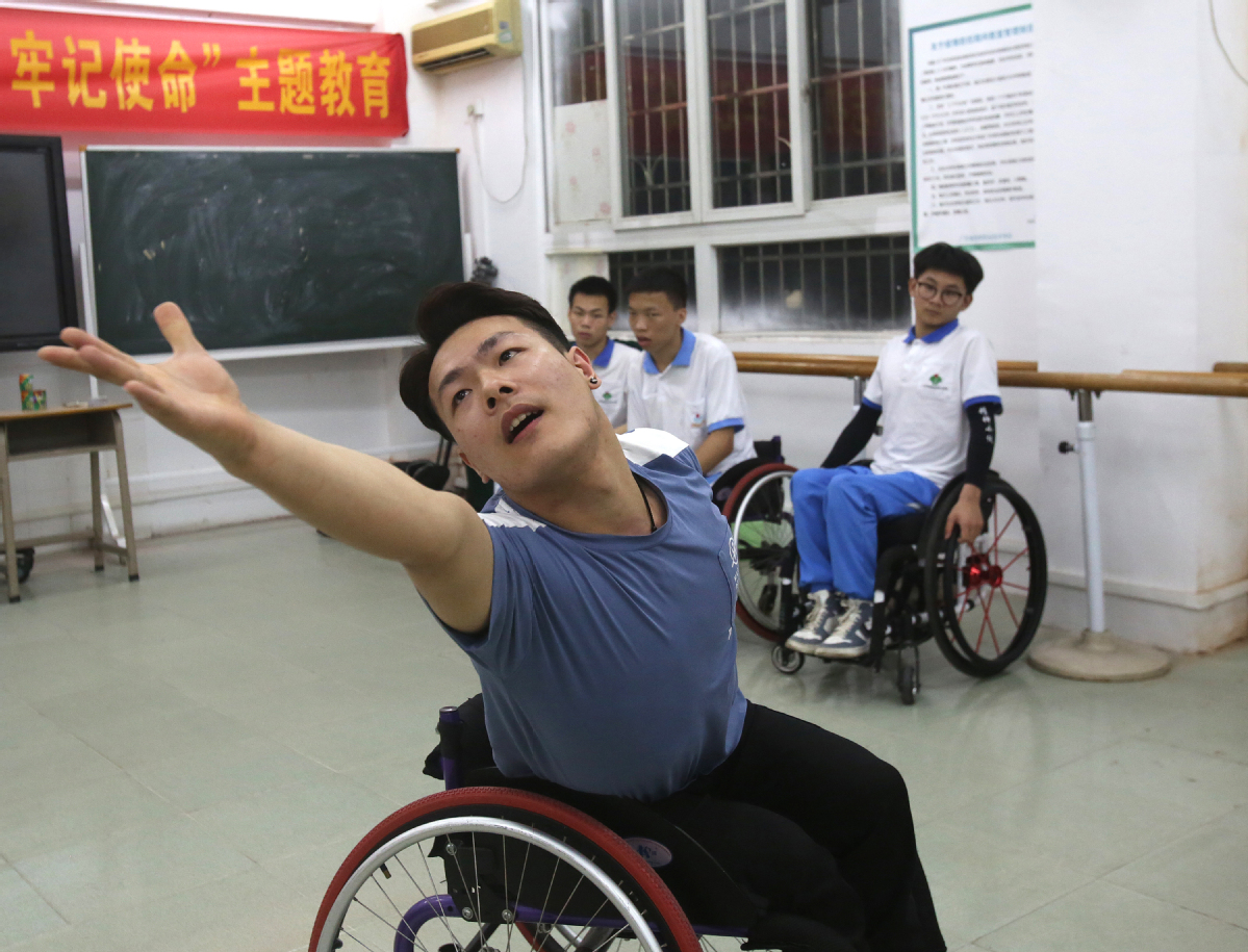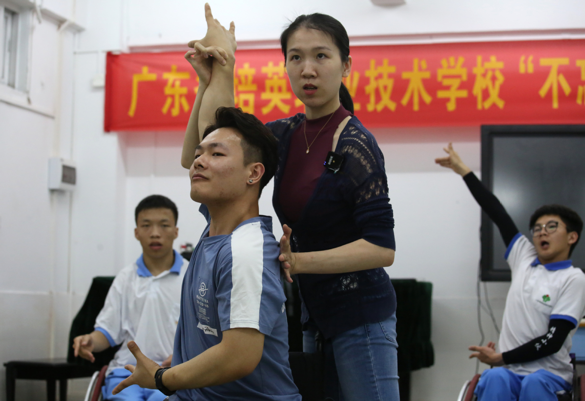 Lin Haoqin, a graduate of Guangdong Peiying Vocational Technical School, demonstrates dance movements to members of the school's wheelchair dancing team. [Zheng Erqi/chinadaily.com.cn